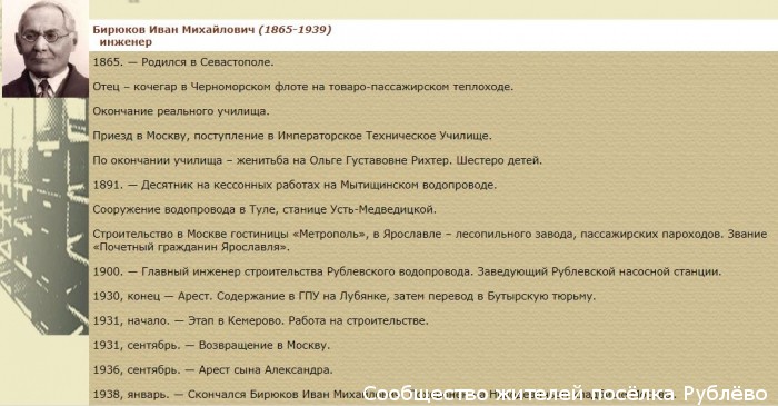 Как же работала станция без спецов? Ведь в те годы она оказалась без химиков, бактериологов. Когда дело бактериологов раскручивали, их сажали, расстреливали. Станция работала благодаря тому, что система была отлажена: низший персонал знал своё дело, крутил гайки, следил за режимами очистки воды. Развития станции в те годы не было, потому что заниматься этим было некому. Но после репрессий многие вернулись в Рублёво. ...История всё расставила на свои места, и светлое имя Ивана Михайловича Бирюкова на Рублёвскую станцию вернула. На административном здании - мемориальная доска с его именем, издана книга о станции, появился свой небольшой музей. И вот главное - к Бирюкову в Рублёво правнук приехал - сын Бобочки!