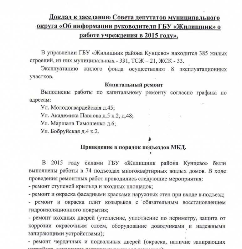 Статьи О районе Кунцево Управляющая организация Отчёт о работе ГБУ «Жилищник» в 2015 году Отчёт о работе ГБУ «Жилищник» в 2015 году Тип статьи: Авторская Отчёт директора ГБУ «Жилищник» И.В.Русанова о работе учреждения в 2015 году, а также запланированные работы по благоустройству дворов в 2016 г..В Рублёво — Обводное ш.,4, и Новорублёвская ул. Ещё в отчёте есть финансовая составляющая «Жилищника». Файл: Читать онлайн | Скачать | 2 Мб русанов, жилищник, отчёт — 30.01.2016 1948 Alekseev Alexey Комментарии RSS Нет комментариев. Ваш будет первым! Войдите или зарегистрируйтесь чтобы добавлять комментарии